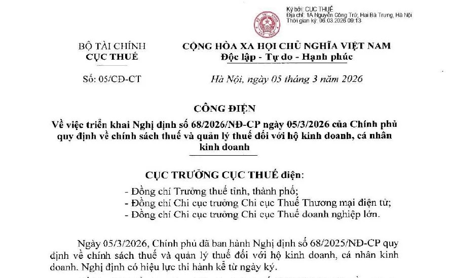 Ngày 05/3/2026, Cục Thuế đã ban hành Công điện số 05/CĐ-CT nhằm triển khai thực hiện Nghị định 68/2026/NĐ-CP của Chính phủ về chính sách thuế và quản lý thuế đối với hộ kinh doanh, cá nhân kinh doanh.